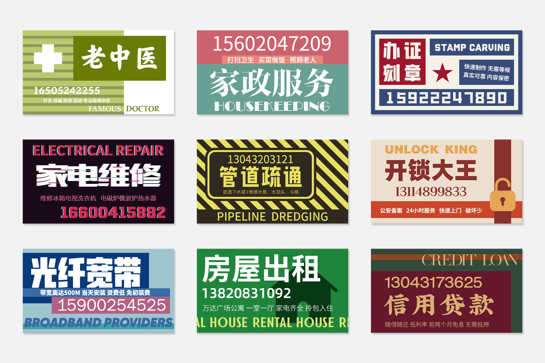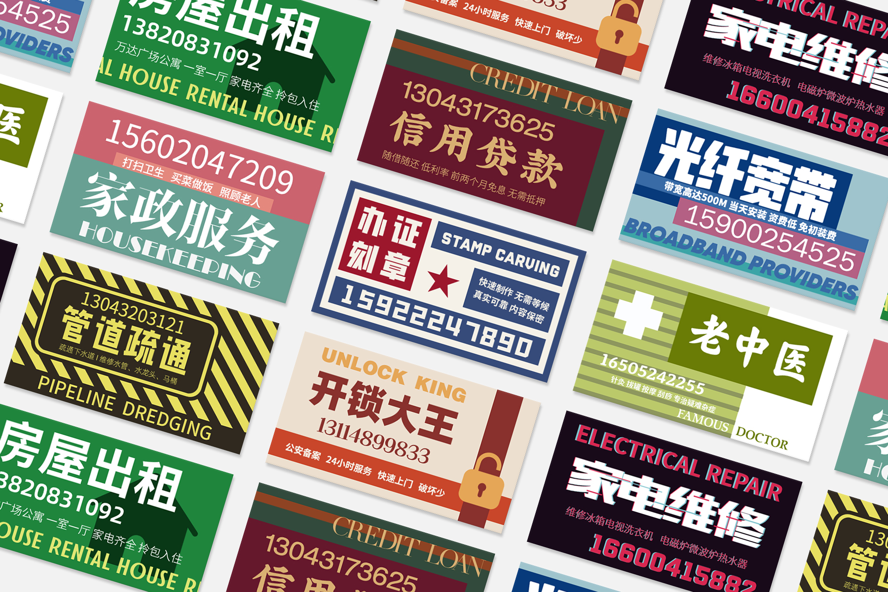 设计意图寻找最适合的表达形式,比如家电维修采用了故障风格,贷款广告运用了更加有老牌银行感的配色和字体,开锁和房屋租赁使用了明显的符号来提高识别度。设计中还对所有卡片做了更加严谨的排版,更合适的字体表现,让小卡片也非常精致。